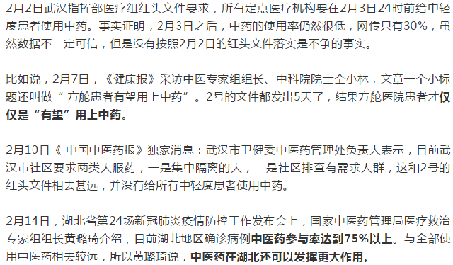 基于SARS期间中医药在参与疫情防治中的表现,从官方层面来看,中医药对于突发公共卫生事件的重要地位已经确定无疑。2月12日,国家卫健委办公厅、国家中医药管理局办公室联合下发《关于在新型冠状病毒肺炎等传染病防治工作中建立健全中西医协作机制的通知》指出,建立中西医结合救治工作机制,加强中医药救治力量。2月13日中央应对新冠肺炎疫情工作领导小组会议要求强化中西医结合,促进中医药深度介入诊疗全过程,及时推广有效方药和中成药。然而,从公开报道来看,武汉的中医参与度却引发质疑。与其他很多省市中医药第一时间介入且参与度高达90%以上相比,2月14日,湖北省第24场新冠肺炎疫情防控工作发布会宣布的消息是:湖北地区确诊病例中医药参与率达到75%以上。而据公开消息,截止2月17日,全国中医药参与救治的确诊病例共计60107例,占比达85.2%。2月19日,湖北省卫生健康委在众目期待中印发《关于进一步做好新型冠状病毒肺炎中西医结合防治工作的通知》,强调力度、安排措施。