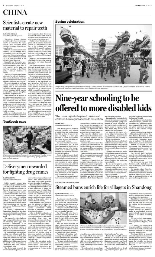 29日《中国日报》第4版,刊发报道《更多残疾儿童将获得九年义务教育》
