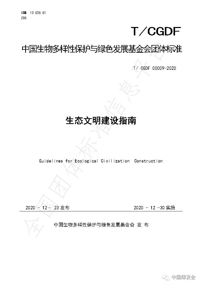 为落实习近平生态文明思想,对全社会开展生态文明建设提供指引,中国生物多样性保护与绿色发展基金会标准中心专门组织技术力量,编制发布了T/CGDF 00009—2020《生态文明建设指南》团体标准,旨在确立生态文明建设的基本原则、建设目标和基本要求,将生态文明建设分领域具体化,可落实,可考核。