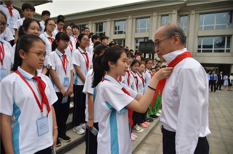 8点20分,首席大检察官张军来到孩子们身边,与受邀前来参加活动的师生们合影留念。北京实验学校(海淀)小学的学生为张军检察长系上红领巾。“早上几点出发的?”“吃过早饭了没有?”在做合影准备工作时,张军转过身,亲切地和身边的孩子们交流。