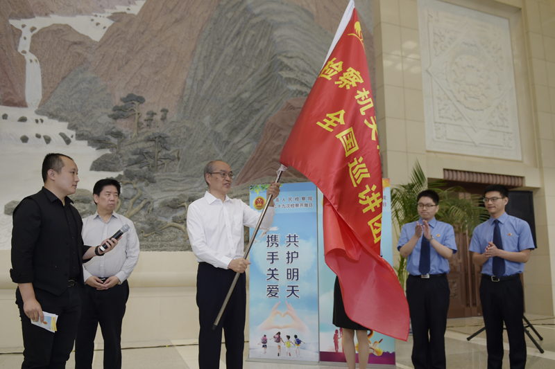 张军简短致欢迎辞后,向在场的小朋友们诚挚送上了儿童节祝福。在欢迎仪式上,还有一个重要环节——“法治进校园再出发--全国法治巡讲团走进三区三州”活动启动仪式,张军亲自向巡讲团检察官授旗,“请大朋友和小朋友们放心,我们一定尽心为全国的少年儿童带去最好的法治课。”检察官郑重接过旗帜。