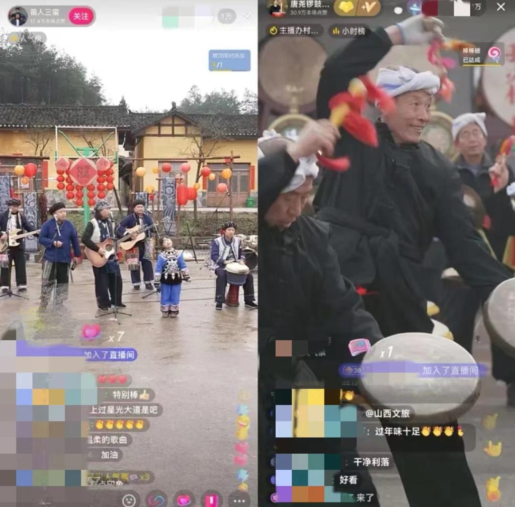 △山西临汾和湖南凤凰两地“村晚”抖音直播连线。