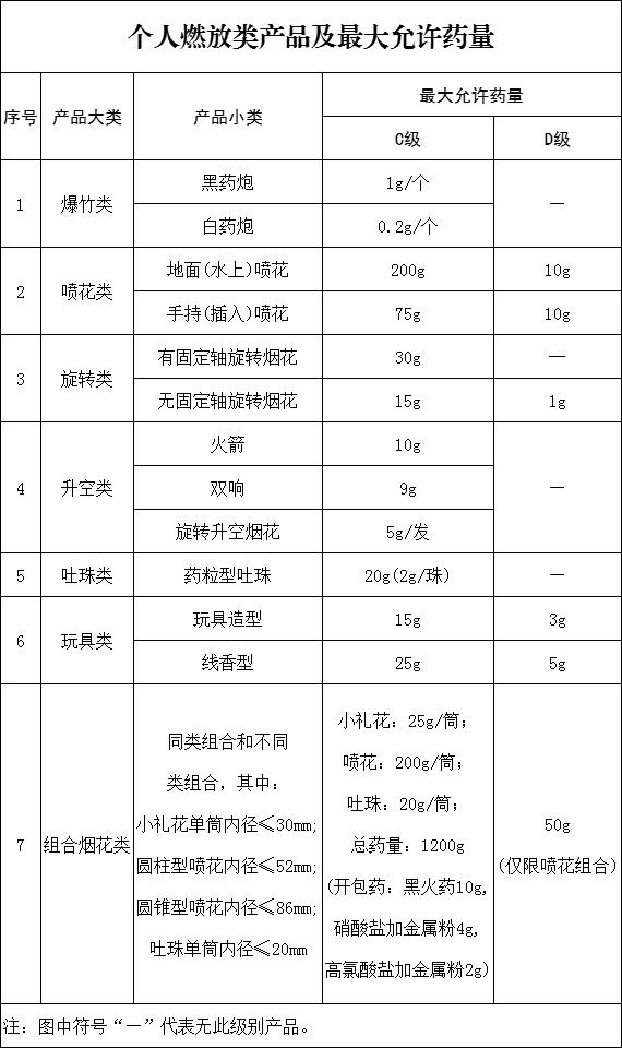 答:比如升空类、组合烟花类产品升空高度较高,不适于在住宅区燃放;禁止燃放含药量超标、燃放无固定轨迹的“加特林”烟花等危险性大的烟花爆竹产品,禁止燃放须专业人员燃放的烟花爆竹和禁止个人燃放的礼花弹、小礼花以及摩擦类、烟雾类产品。(允许个人燃放产品及最大药量具体见下图)