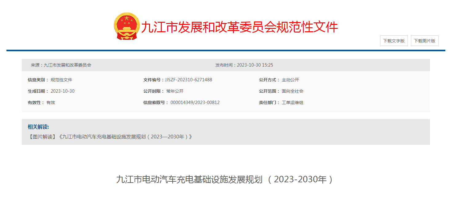 10月30日,九江市发展和改革委员会发布《九江市电动汽车充电基础设施发展规划 (2023-2030年)》明确: