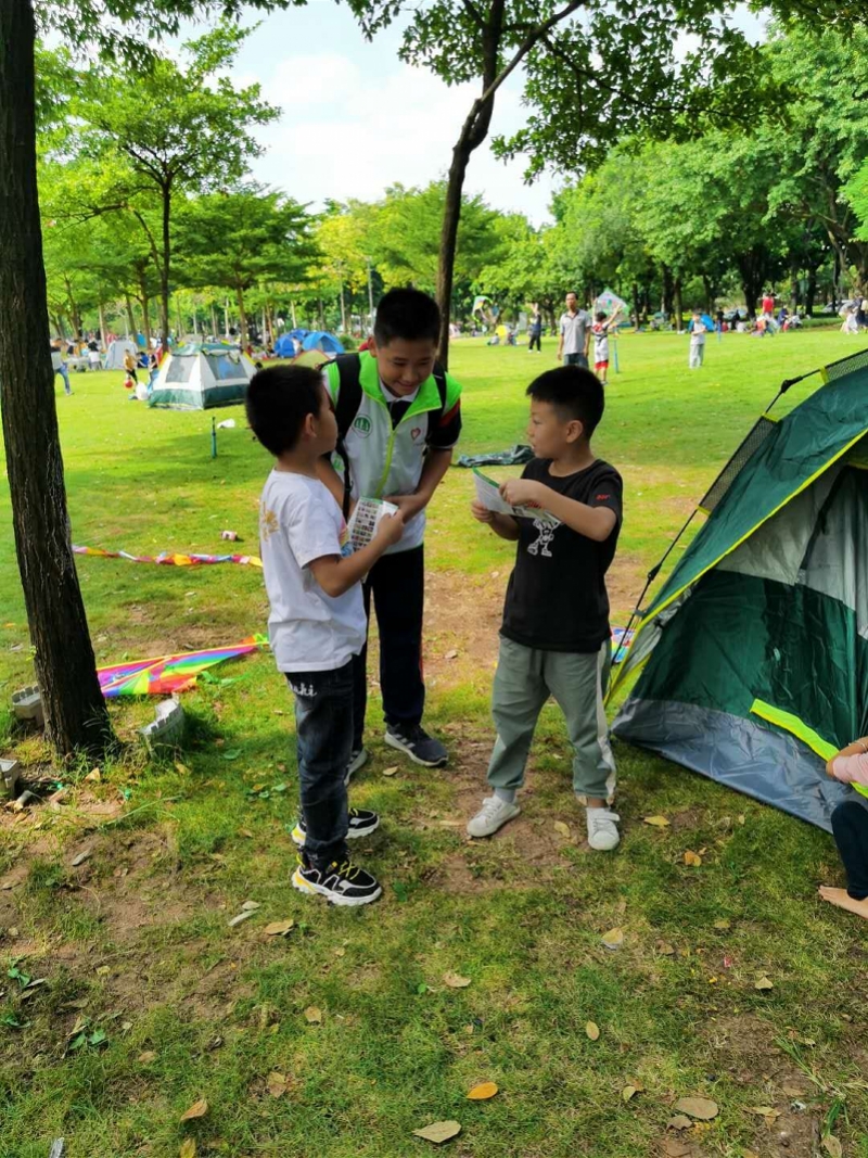志愿者向在二沙岛玩的小朋友派发保护野生动物宣传手册。 受访者供图