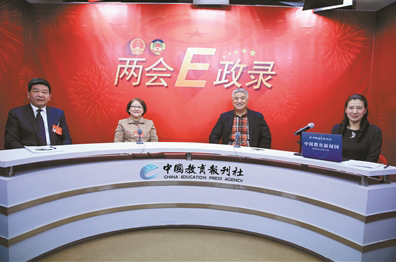 3月9日,张志勇(左一)、孙晓梅(左二)、孙云晓(左三)做客中国教育报刊社“两会E政录”演播室,围绕家庭教育热点问题进行深度探讨。(本报记者 修伯明/摄)