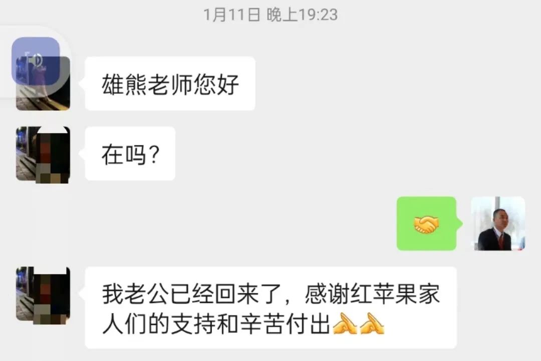 那天晚上,她发了一个微信给我说:“雄熊老师您好,在吗?我老公已经回来了,感谢红苹果家人们的支持和辛苦付出。”