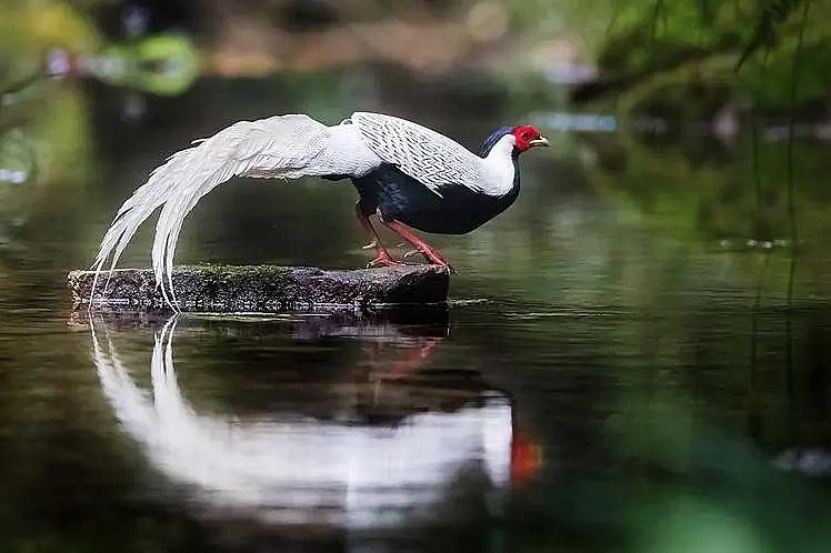 白鹇,国家二级保护动物,属雉科鹇属鸟类,翎色洁白,啼声喑哑。白鹇鸟,雌雄异色。头顶具冠,翅短尾长。雄鸟上体白色,头顶蓝黑色羽冠;红脸,白尾,白翅。下体蓝黑色,脚红色。雌鸟黑冠,通体橄榄褐色。白鹇鸟自古即是名贵的鸟。《禽经》记载“似山鸡而色白,行止闲暇”。