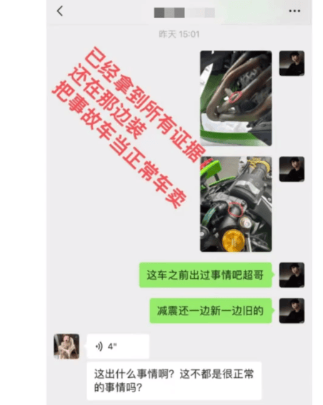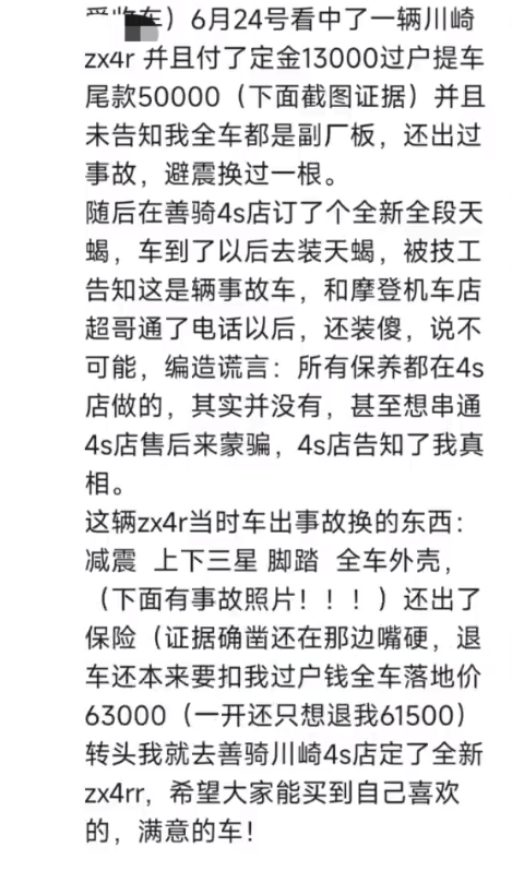 最近,上海一名车友表示,自己在2024年6月在上海一著名网红二车商处购买了川崎Ninja ZX4R二手车。然后去善骑4S店订了个全新全段天蝎,车到了以后去装天蝎,被技工告知这是辆事故车。当时大网红车商并没有告知这名买家,该Ninja ZX4R之前发生过事故。买家一气之下把这事发到了网上进行曝光。