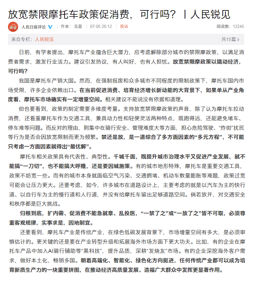 今天,人民日报的评论员也来为解禁摩摇旗呐喊了:“政策的制定需要多维度考量。禁还是放,是一道综合了多方面因素的“多元方程”,不可能只考虑一方面因素就得出“最优解”。既提升城市治理水平又促进产业发展,就不能搞“一刀切”。