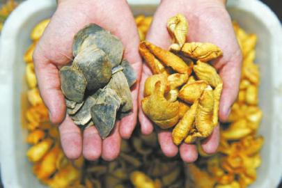 缴获的穿山甲鳞片原片和炮制后的入药片(右)。