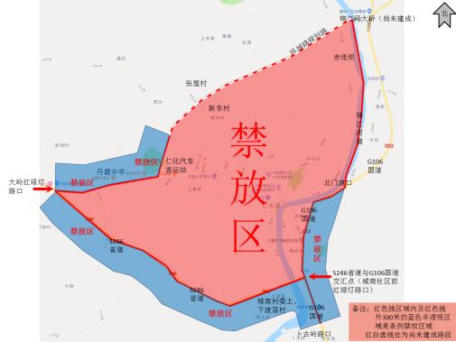 (二)南面以省道S246线与G106国道交汇点(即城南社区前红绿灯)至省道S246线大岭红绿灯路口为界(其中包括省道S246线以南的城南村委会上、下渡落村为禁放区)。