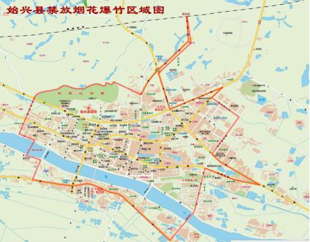 (一)环绕始兴县城区,以火车站为起点经站前路、城北路、丹凤山公园往南至丹凤西路、沿江北路(墨江平湖闸坝);墨江平湖闸坝向东经金润大桥往南至河南路;沿河南路往东至天元大桥、体育东路,经红旗东路往东至始兴中学;始兴中学往西经城东路、黄花园东路、黄花园北路至北门路与永安大道交汇处(五里山三叉路口);沿永安大道往西至迎宾大道连接站前路,以上路线所围成区域及所经路线外侧100米内范围为禁放区。