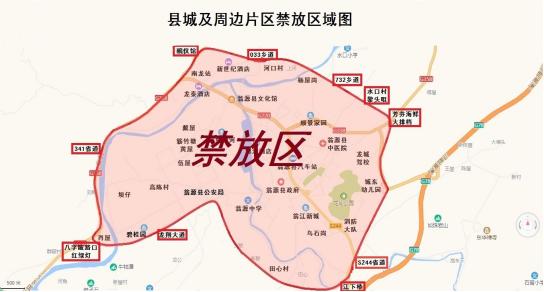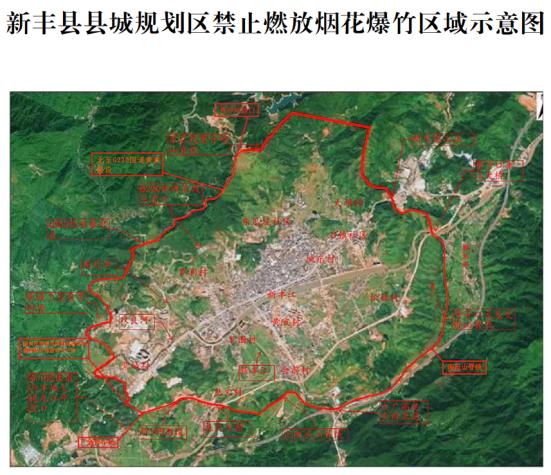 县城规划区以下区域实行全时段禁放,禁放范围:东以贵子口丰江大桥、新宝塔山庄连线为界;西以丰城大道(韶关市粤联民用爆破器材销售有限公司新丰分公司)、105国道(广新停车场)至紫城牛奶场为界;南以贵子口丰江大桥沿山脊线至会前互通为界;北以 X853旭泰农庄沿山脊线至G220线黄沙坑路口,再沿东瓜坑君子嶂、大洞村后山山脊线为界;西北以紫城牛奶场向东沿山脊线至 X853 旭泰农庄,再沿山脊线至G220师范段三岔口为界。