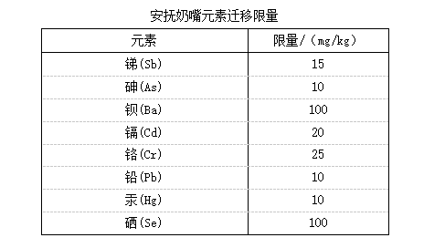 测试结果显示,20款样品中,有2款样品“特定元素的迁移”未检出,其余18款样品均测出含有不同程度的元素,但是实测值均在所参照标准的限值内。特定元素的迁移限量见下表。