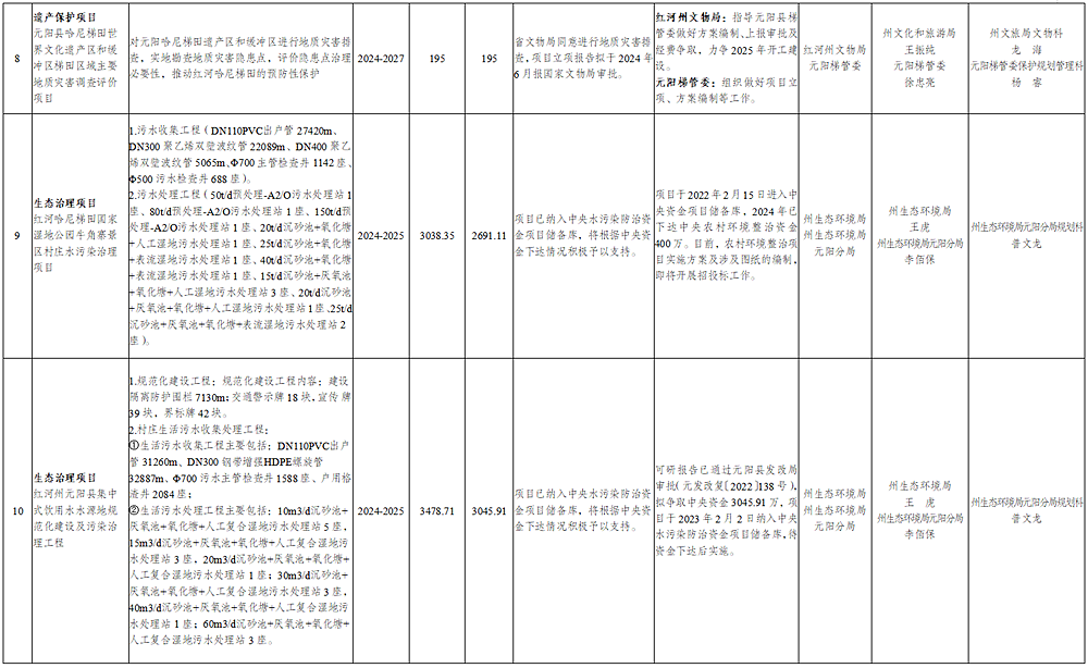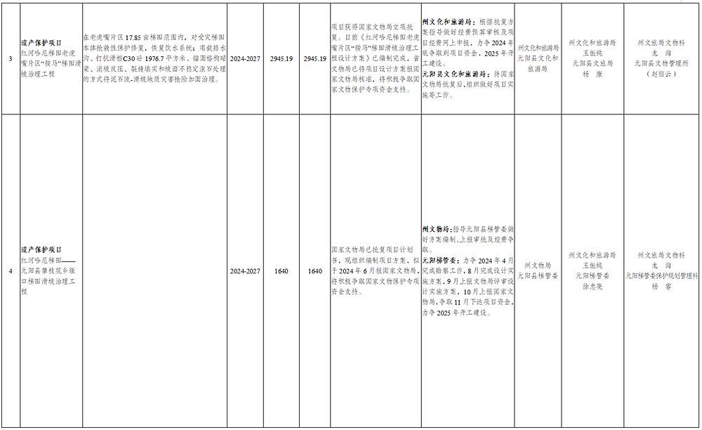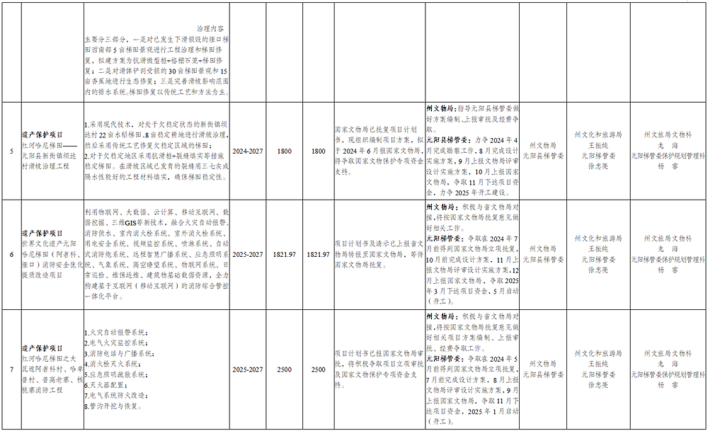 4.开展传统村落和文物保护提升行动。科学编制保护区村庄建设规划,严格控制村庄规模,引导群众建房高度、体量、形态、色彩以及构造装饰与梯田文化景观协调一致。学习借鉴“千万工程”经验,深入实施城乡绿化美化三年行动,加大民居保护、“两污”治理、绿化美化力度,建设宜居宜业和美乡村,留住最美乡愁。对元阳全福庄中寨、上主鲁老寨、牛倮普村、阿者科村和垭口村5个世界遗产申报重点村寨,实行控制性保护,村寨所有建设活动应按遗产区管理规定严格执行;加快制定出台传统民居保护奖补办法,对挂牌保护民居进行奖补。加大各级重点文物保护单位、文物点的保护力度,严格按照有关文物保护要求实施文物保护修复项目;加强保护区应急管理和消防安全体系建设,高度重视古村落等文物建筑、博物馆火灾风险防范,实施阿者科、垭口等消防安全优化提质改造项目,做好对自然灾害、公共卫生、安全隐患等重大事件的风险评估、监测预警、应急处理,积极申报创建国家文物保护利用示范区。(责任单位:州文化和旅游局、哈尼梯田管理局,元阳县人民政府)