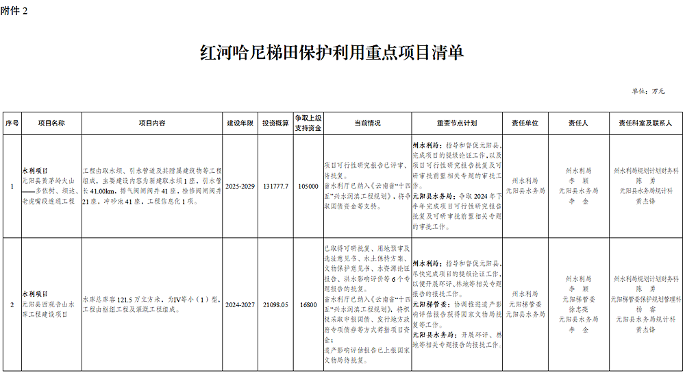 3.开展循环水系保护提升行动。抓实“水的命脉”的研究保护工作,做实水环境规划,以规划引领补短板,科学调水,合理用水,合力保障水资源平衡利用。编制梯田水资源综合利用规划,加强水利设施配套改造,因地制宜修建蓄水坝塘,加大沟渠修复和水源林保护力度,构建梯田灌溉水系保护体系,加快实施西观音山水库、黄茅岭大山—多依树水系联通等工程。实行最严格水资源管理制度,沿用“木刻分水”、“守林人”“赶沟人”等传统管水方式,建立“赶沟人”补助机制,对遗产区180名“赶沟人”每人每月给予800元的资金补助。建立健全农村供水工程计量收费制度,引导群众节约用水,保障农村饮水安全和农田灌溉用水。(责任单位:州水利局、哈尼梯田管理局,元阳县人民政府)