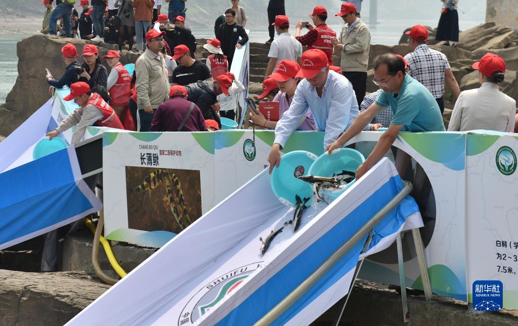 长江上游珍稀特有鱼类国家级自然保护区云南段增殖放流活动在云南省水富市举行(2021年4月23日摄)。新华社发