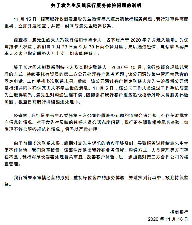 招商银行催收过世客户欠款一事,目前当事双方均有进一步说明。