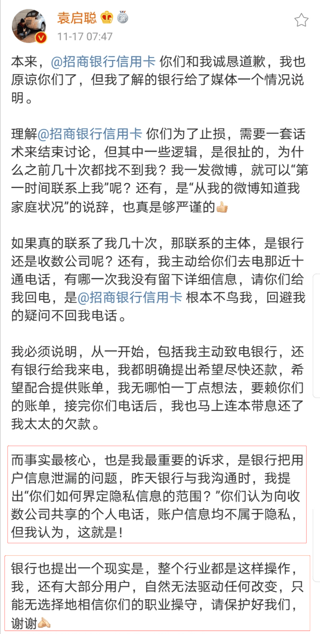 11月17日,袁启聪针对招商银行回应作出说明,其中他向招行提出质疑:“如何界定隐私信息的范围?”