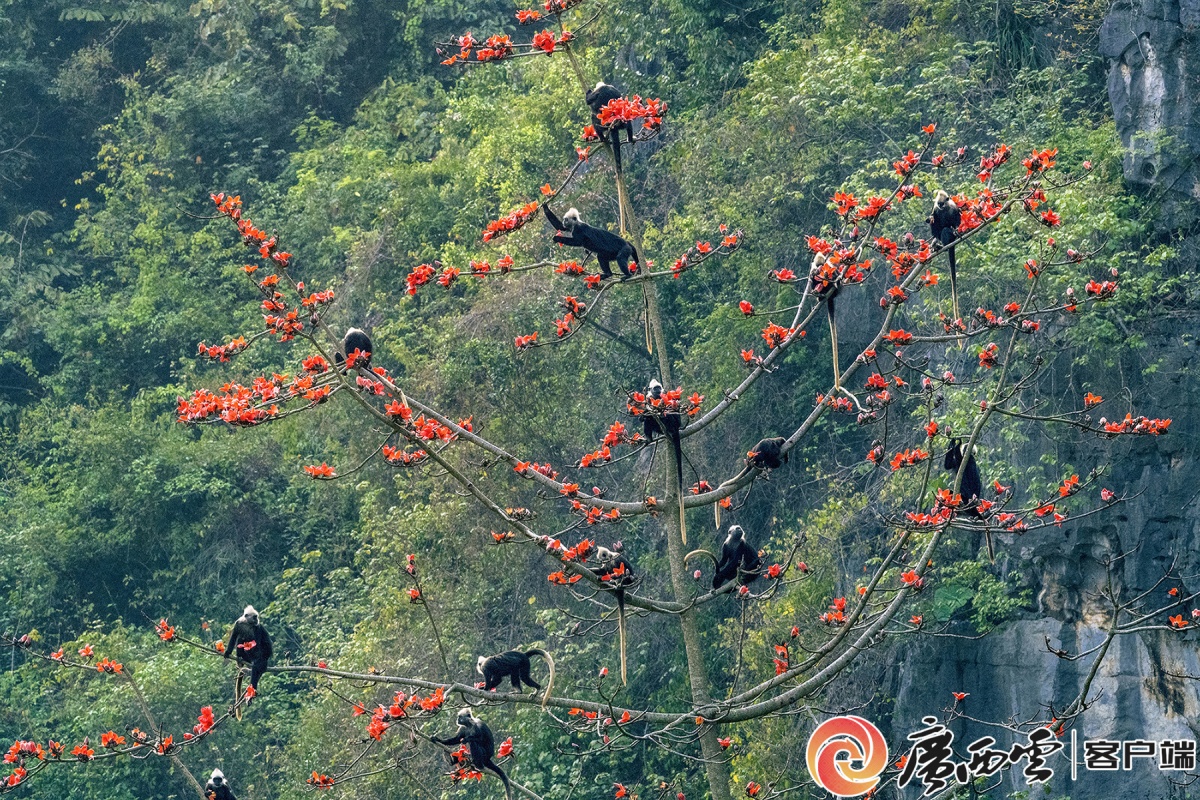 广西崇左白头叶猴国家级自然保护区内,一群白头叶猴正在采食木棉花蜜。黄杰斌摄