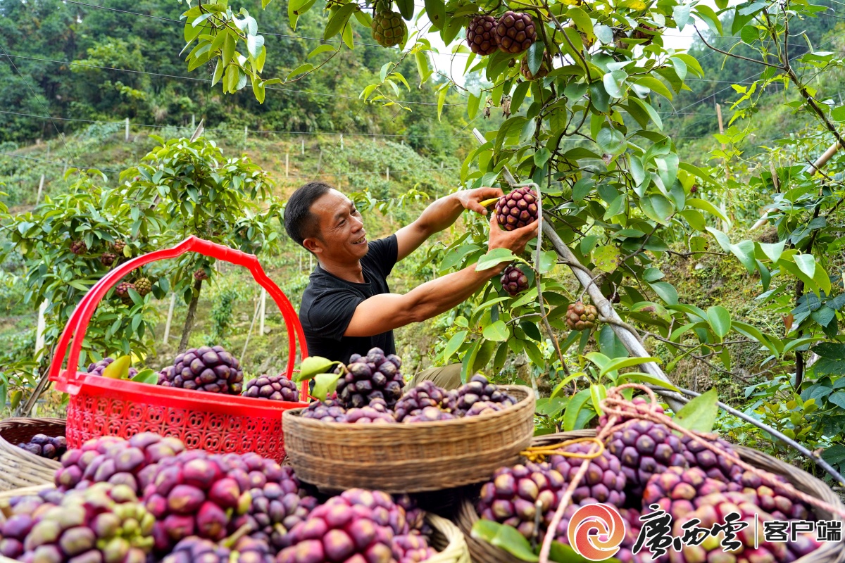 在金秀瑶族自治县六巷乡王钳村朗冲屯中药材种植基地,村民正在采摘成熟的黑老虎出售。高如金 摄