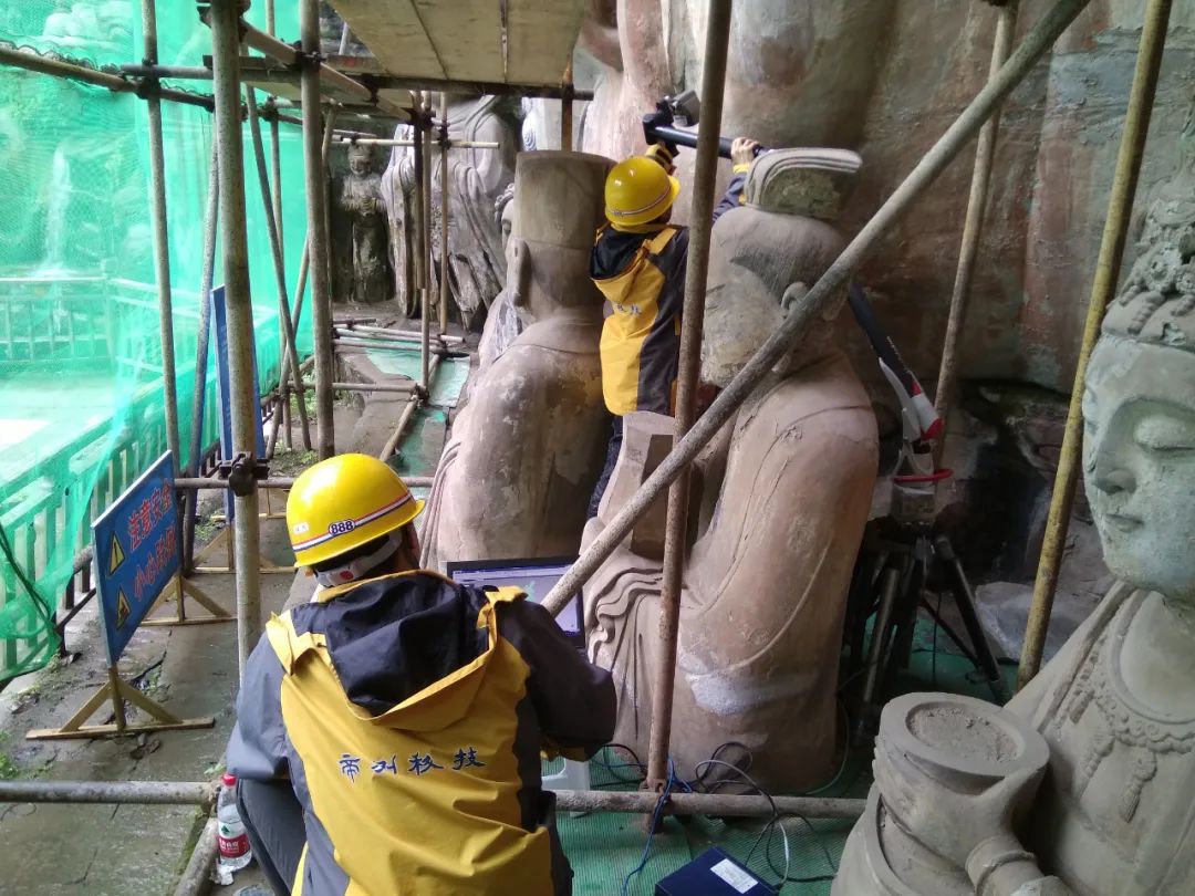 强化科技成果运用。一是注重高技术探索应用。在大足石刻保护维修中,坚持技术创新、工艺创新、材料创新,在多项保护工程中所采用的技术措施,均处于国内石质文物保护的领先水平。特别是“全国石质文物保护一号工程”——大足石刻千手观音造像抢救性保护工程的实施,创造性地将工业X光探伤、红外热成像探测等技术首次成功运用于石质文物勘察研究,开创了多学科、多领域开展大型不可移动石质文物修复的先河,积累了大量文物保护的宝贵经验。二是注重高科技平台建设。与意大利合作,建成了先进的“大足石质文物保护中心”;利用网络数字技术,建成了覆盖大足石刻30多处重要石刻的“大足石刻安全技术防范中心”;利用现代监测和信息技术,建成了具有动态监测和信息化管理功能的“大足石刻监测预警中心”。利用三维数字测量技术,完成了大足宝顶山石刻数字测绘,为大足石刻的科学保护提供了有力支撑。三是注重高效率遗产监测。主动开展日常监测、定期监测和专项监测,为大足石刻保护和管理提供有效数据支撑和决策依据,并根据监测结果,开展了一系列预防性保护工作,加快了大足石刻从抢救性保护向预防性保护方向的转变。大足石刻2017年、2018年、2019年监测年度报告连续三年被评为“中国世界文化遗产优秀监测年度报告”。