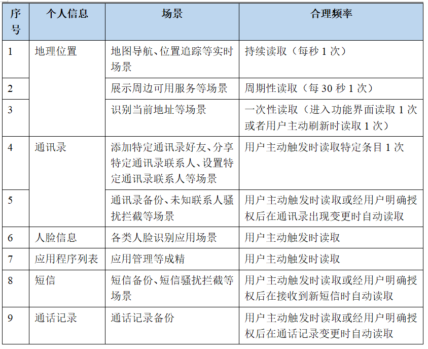 随着相关文件出台,对数据收集的数量、频度也被规范。在《移动互联网应用程序个人信息保护管理暂行规定(征求意见稿)》以及《网络安全标准实践指南—移动互联网应用程序(App)收集使用个人信息自评估指南(征求意见稿)》两份文件中其实详列了关于数据处理者收集数据的具体频度要求。我们整理如下表所示: