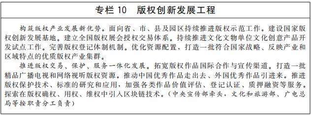 ——知识产权运用取得新成效。知识产权转移转化体制机制更加完善,知识产权归属制度更加健全,知识产权流转更加顺畅,知识产权转化效益显著提高,知识产权市场价值进一步凸显,专利密集型产业增加值和版权产业增加值占GDP比重稳步提升,推动产业转型升级和新兴产业创新发展。