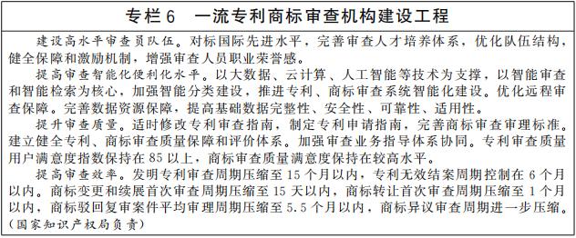 提高知识产权审查质量和审查效率。完善适应创新发展需求的知识产权审查管理体系,优化专利、商标审查协作机制。提升专利商标审查机构能力水平,强化专利、商标、版权、地理标志、植物新品种全流程审查质量管控,提升知识产权授权确权质量。提高专利、商标审查业务精细化管理水平,优化审查资源配置,加强智能化技术运用,提升审查效能,缩短审查周期。完善专利、商标审查模式,加强审查与产业发展的政策协同和业务联动,满足产业绿色转型和新领域新业态创新发展等社会多样化需求。(中央宣传部、工业和信息化部、农业农村部、国家林草局、国家知识产权局等按职责分工负责)