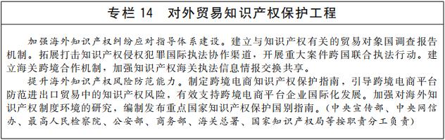 完善维护国家安全的知识产权政策。研究制定事关国家安全的关键核心技术知识产权保护规则。依法管理涉及国家安全的知识产权对外转让行为,完善知识产权对外转让审查制度。完善知识产权反垄断、公平竞争相关法律法规和政策措施。推进我国知识产权有关法律规定域外适用。研究建立针对进口贸易的知识产权境内保护制度。完善跨境电商知识产权保护规则。(中央宣传部、中央网信办、国家发展改革委、科技部、工业和信息化部、商务部、市场监管总局、国家国防科工局、国家知识产权局等按职责分工负责)
