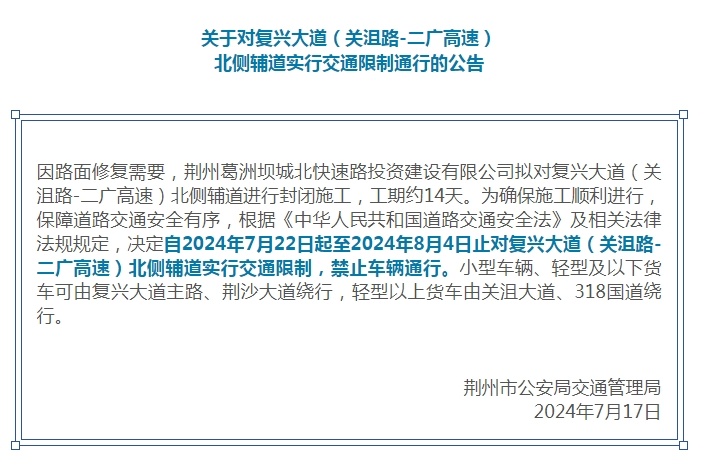 近日,荆州市公安局交通管理局发布《关于对复兴大道(关沮路-二广高速) 北侧辅道实行交通限制通行的公告》,决定自2024年7月22日起至2024年8月4日止对复兴大道(关沮路-二广高速)北侧辅道实行交通限制,禁止车辆通行。