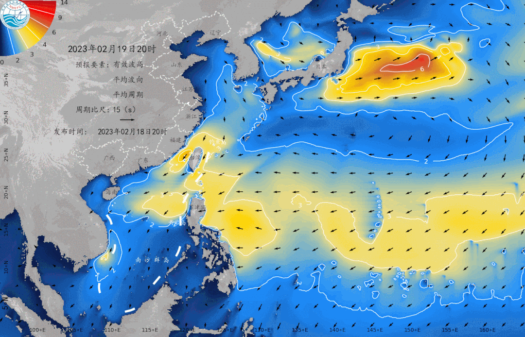受冷空气和低压配合的影响,预计2月19日夜间到20日白天,东海南部、钓鱼岛附近海域、台湾海峡、台湾以东洋面、南海东北部、巴士海峡将出现3.5到5米的大浪到巨浪区;浙江南部、福建近岸海域将出现2到3米的中浪到大浪,近岸海域海浪预警级别为蓝色。请在上述海域作业的船只注意安全,沿海各有关单位提前采取防浪避浪措施。