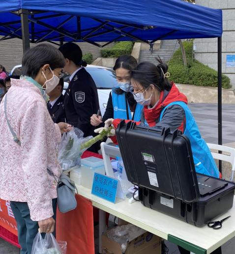 现场通过楼宇大屏幕滚动播放宣传视频、派发法律知识手册、法律法规答疑宣讲、食用农产品快检等方式为居民提供服务。现场气氛热烈, 取得了良好的宣传效果。当天检测的29批次农产品结果全部为阴性。