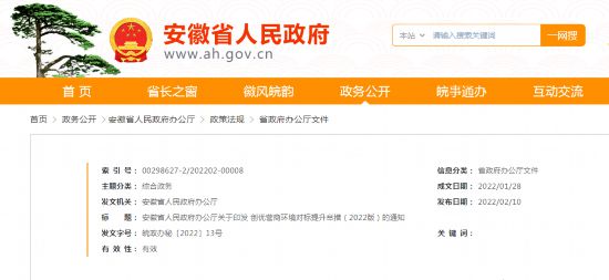 2月10日,安徽省人民政府官方网站发布了《创优营商环境对标提升举措(2022版)》。文件内容涉及企业开办注销领域、工程建设项目报建领域、获得电力领域、不动产登记领域、纳税服务领域等18个领域,共179项措施。具体内容如下: