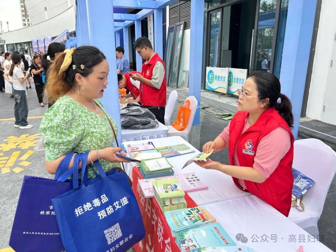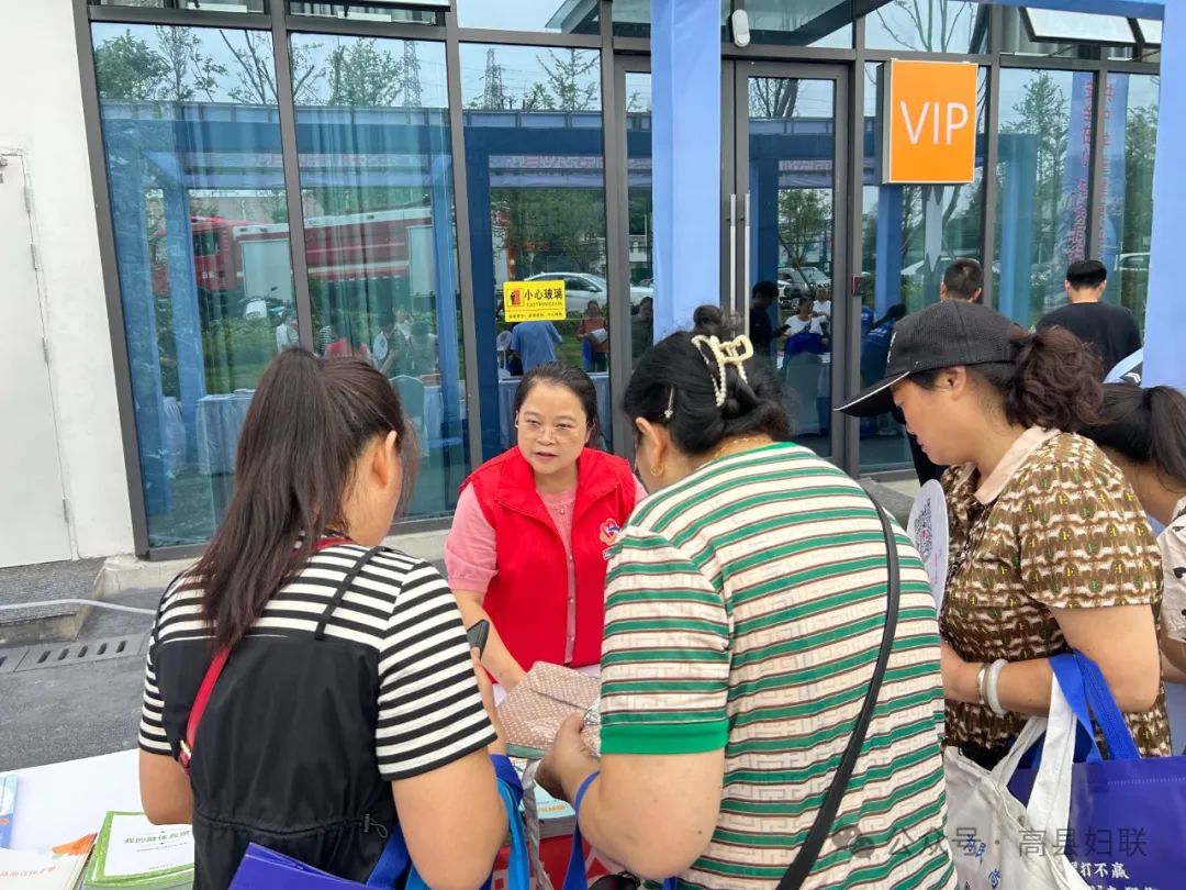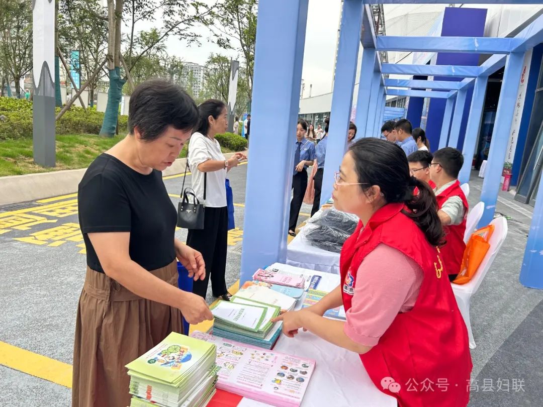 在高县翰笙文化体育艺术中心,县妇联组织巾帼志愿者通过设立咨询台、发放宣传资料、面对面咨询等形式宣传普及妇女儿童权益维护、禁毒防艾、防溺水及安全生产等相关知识,向过往群众发放《宪法》《反家庭暴力法》《妇女权益保障法》《未成年人保护法》《家庭教育促进法》《女孩悄悄话》《安全生产篇》《反邪教篇》《禁毒篇》《女性网络安全宣传手册》等妇女儿童权益维护法律法规和生产生活密切相关的宣传资料300余份,赠送“拒绝毒品 预防艾滋”宣传手提袋、“家风家教”宣传围裙和相框150余份,并结合妇联维权服务工作实际,有针对性的对群众普遍关注和常见常用的涉及妇女儿童权益维护的法律法规知识进行现场答疑解惑,进一步提高了妇女群众学法、守法、尊法、用法的法律意识和依法维权的能力。