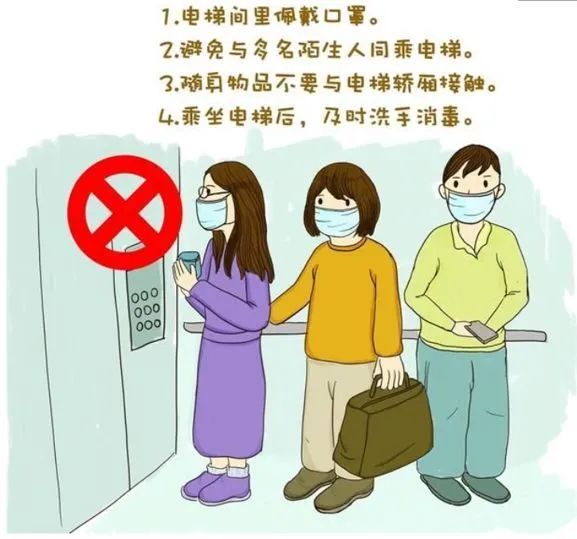 电梯间是”高危场所”,空气不流通。搭乘电梯一定要带口罩,避免用手直接按电梯按钮