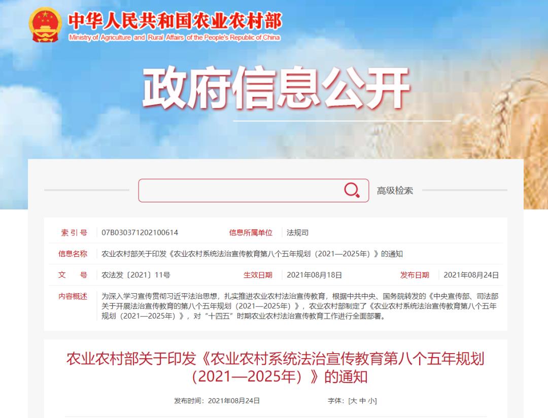 为深入学习宣传贯彻习近平法治思想,扎实推进农业农村法治宣传教育,根据中共中央、国务院转发的《中央宣传部、司法部关于开展法治宣传教育的第八个五年规划(2021—2025年)》,我部制定了《农业农村系统法治宣传教育第八个五年规划(2021—2025年)》。现印发给你们,请结合本地区、本部门实际,认真组织实施,切实抓好贯彻落实。