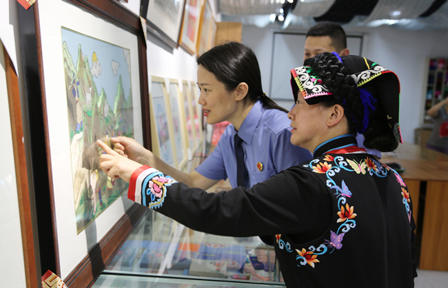 北川羌族自治县检察院检察长张萍参观党的二十大代表陈云珍的羌绣生活体验馆。