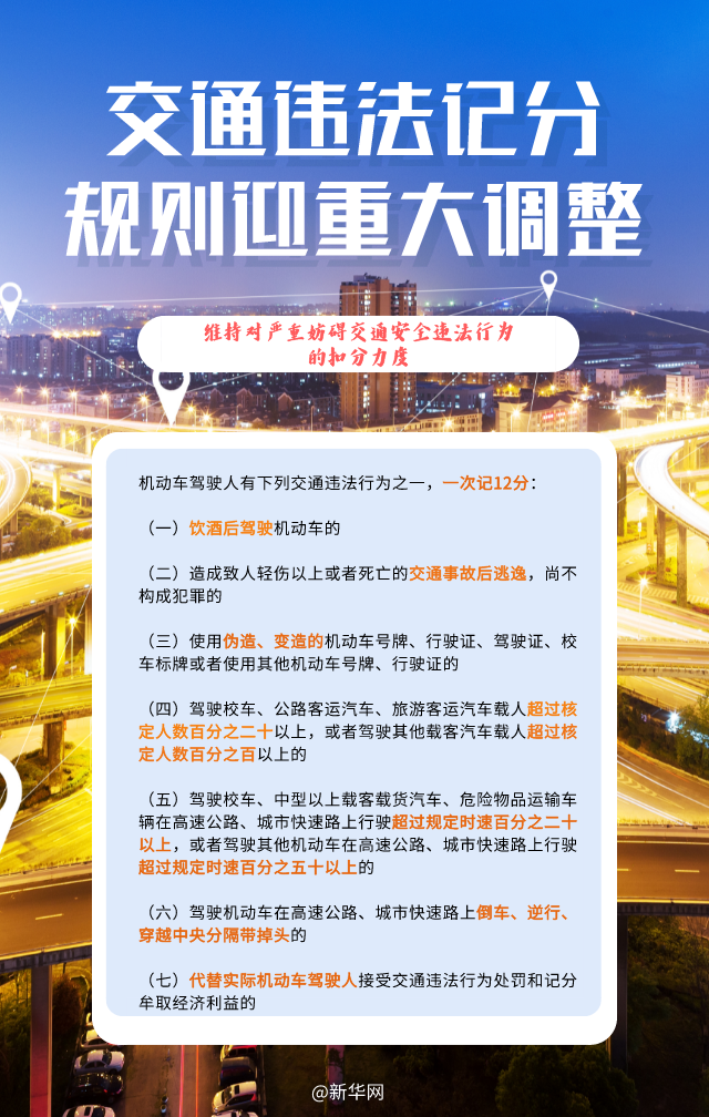 《道路交通安全违法行为记分管理办法》根据交通违法行为的严重程度,设立一次记12分、9分、6分、3分、1分等五档记分。在保持对酒后驾驶、交通肇事致人伤亡后逃逸、使用伪造变造牌证等严重妨碍交通安全的违法行为管理力度的前提下,降低了部分交通违法行为记分分值,删除了驾车未放置检验标志、保险标志等交通违法行为记分。