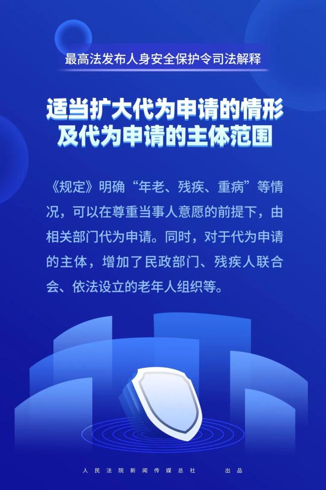 但在实践中,还存在因年老、残疾、重病等原因致使受害人不敢或者不能亲自申请人身安全保护令的情形。为最大限度保障该类特殊困难群体能够依法及时获得人身安全保护令制度的救济,《规定》在反家庭暴力法基础上,对代为申请的情形进行了适当扩充,明确“年老、残疾、重病”等情况,可以在尊重当事人意愿的前提下,由相关部门代为申请。