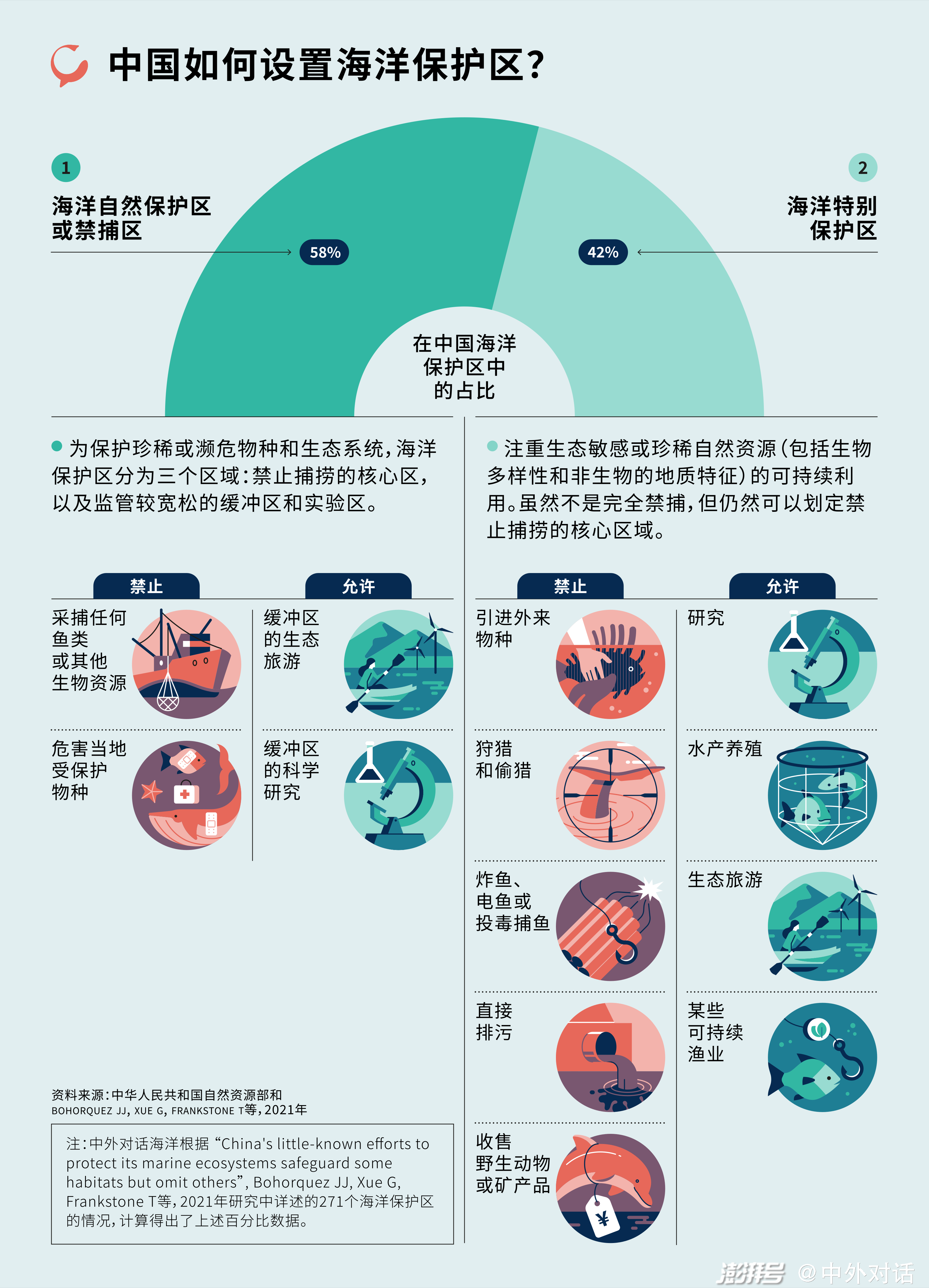 截至2019年底,中国共建立了271个海洋保护区,总面积约为12.4万平方公里,占管辖海域面积的4.1%,与2021年底全球海洋保护区占海洋总面积的7.92%这一成果,以及“爱知目标”11(保护全球10%的海岸与海洋面积)相比较,不管在保护的“质”和“量“上都有一定差距。