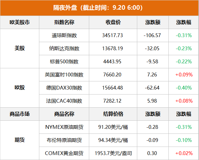 美股:道指收跌0.31%,报34517.73点;纳指收跌0.23%,报13678.19点;标普500指数收跌0.22%,报4443.95点。