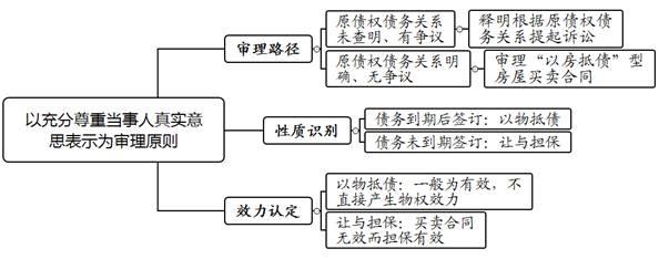 法院审理该类案件要坚持充分尊重当事人真实意思表示的原则,排除虚假意思表示,识别虚假诉讼及“套路贷”,谨防当事人恶意串通损害权利人的合法权益。具体而言,审理“以房抵债”型房屋买卖合同,首先要将其区分于一般的房屋买卖合同,其次要明确请求权基础,再次要判断合同性质及效力,最后作出实体裁判。