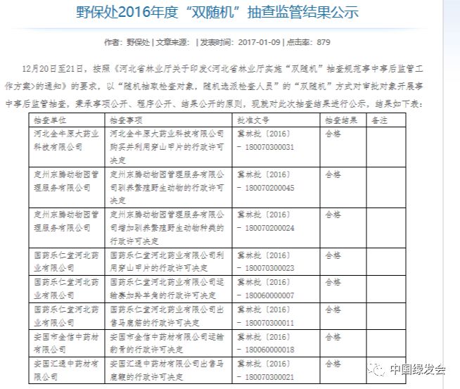 河北省林业厅野保处2016年度“双随机”抽查监管结果公示,对安国市金信中药材有限公司抽查的“安国市金信中药材有限公司运输豹骨的行政许可决定”显示为合格。批准文号是:冀林批〔2016〕- 180060000018