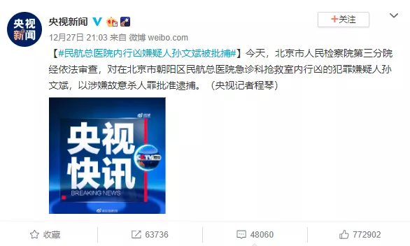 昨日(27日),北京市人民检察院第三分院经依法审查,对在北京市朝阳区民航总医院急诊科抢救室内行凶的犯罪嫌疑人孙文斌,以涉嫌故意杀人罪批准逮捕。
