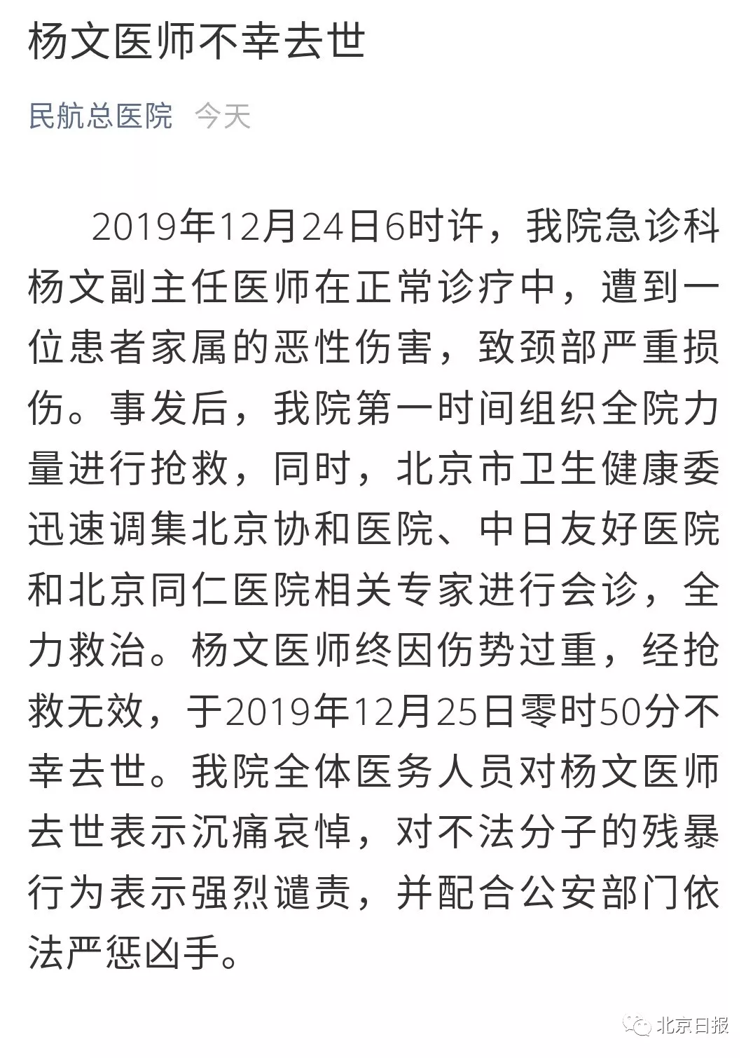 2019年12月24日6时许,民航总医院一男子持刀将杨文医师扎伤,致颈部严重损伤。事发后,该院第一时间组织全院力量进行抢救,同时,北京市卫生健康委迅速调集北京协和医院、中日友好医院和北京同仁医院相关专家进行会诊,全力救治。杨文终因伤势过重,经抢救无效,于2019年12月25日零时50分去世。犯罪嫌疑人已被朝阳公安分局依法刑事拘留。