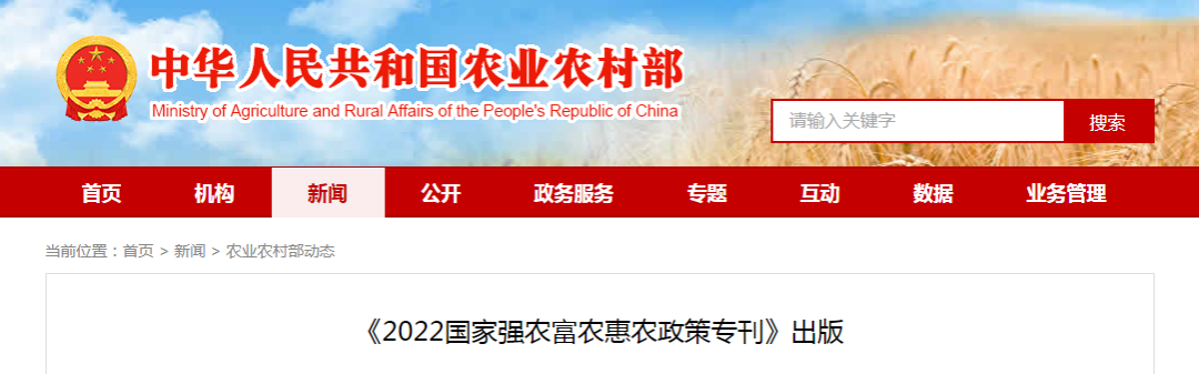 据介绍,该专刊收录了《中共中央国务院关于做好2022年全面推进乡村振兴重点工作的意见》、《农业农村部关于落实党中央国务院2022年全面推进乡村振兴重点工作部署的实施意见》,刊登了农业农村部政策与改革司牵头整理的《2022年国家强农惠农富农政策措施选编》。《选编》从农业支持保护、资源环境保护、产业发展、农村改革等方面系统梳理了四大类67项含金量高、指导性强的政策措施,