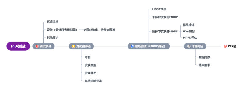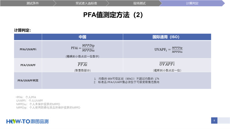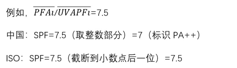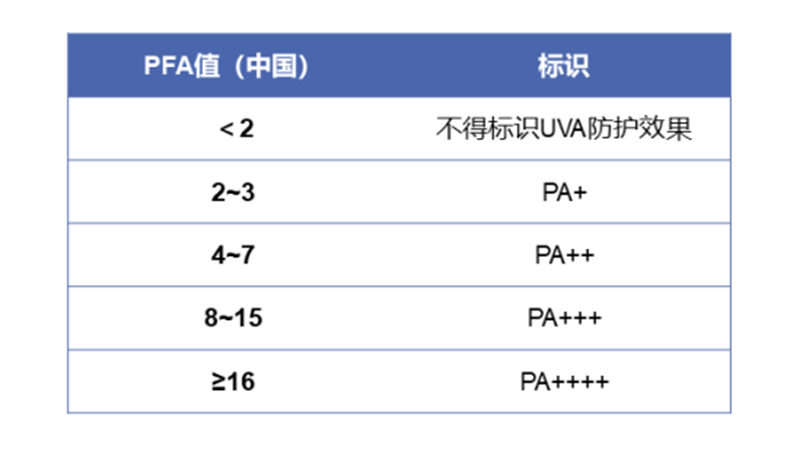 PFA和UVAPF区别:中国采用PFA,而ISO采用UVAPF,这两者的差别在于皮肤在UVA下暴露结束后评估时间不同。PFA是UVA暴露结束后2~4小时评估,UVAPF是UVA暴露结束后2~24小时评估。