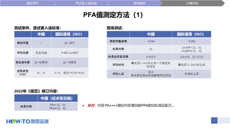 标准对照:《规范》征求意见稿新增S2标准品,与ISO保持一致。其原因在于市场产品的更新迭代,标识高PA值的防晒品趋多,S1标准品无法满足当前测试需求,因此针对PA+++/PA++++防晒品增加了S2标准品。